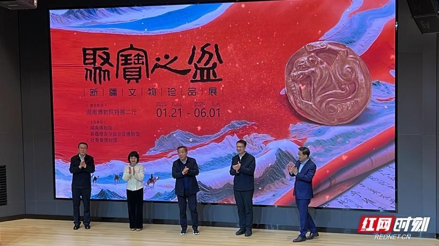 “聚宝之盆——新疆文物珍品展”开幕式现场。1月21日,由湖南博物院联合新疆维吾尔自治区博物馆、吐鲁番博物馆共同主办的“聚宝之盆——新疆文物珍品展”正式开幕。这是新疆珍贵文物首次大规模赴湘展出,展览集中展现了先秦至清代新疆地区的历史人文艺术精华,将持续展出至6月1日。