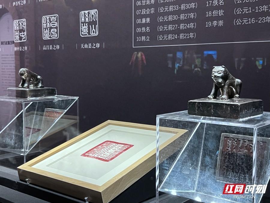 部分展品。“大家在展厅参观时,可以在一些丝织品文物上看到汉字。这是汉唐时期,新疆地区与中原地区交往交流的实证。”湖南博物院 “聚宝之盆——新疆文物珍品展”展览执行策展人唐哲昊介绍,该展览分为“在那遥远的地方”“丝路古道响驼铃”“春风已度玉门关”三个部分。其中,汉唐时期丝路文化的展示成为了展览的一大亮点。自西汉张骞首次出使西域,到唐朝成为东西文明交汇的重要通道,新疆始终是丝绸之路的关键枢纽。在这条古老商道上,世界各地的商人和官员往来不绝,多样的思想与技术在此交融,共同铸就了这一地域丰富多彩的文化遗产。这种多元文化的交流与融合,为我们了解新疆的历史与艺术提供了宝贵视角。